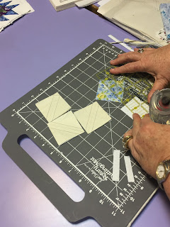 | 2.Use 5"squares of a background and an accent fabrics right sides together |